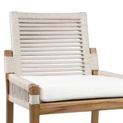 Outdoor dining side chair in Golden Brown Teak finish with taupe synthetic rope support system and fabric covered seat cushion.