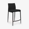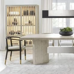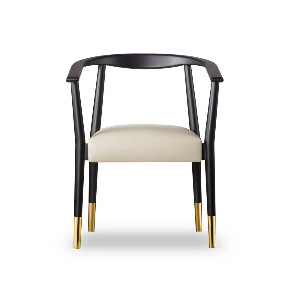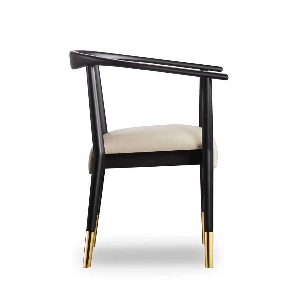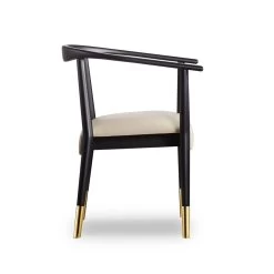 Kelly Hoppen design dining side chair with Matt Black finished wood and upholstered in Fawn Prestige fabric and legs are capped with brass ferrules.