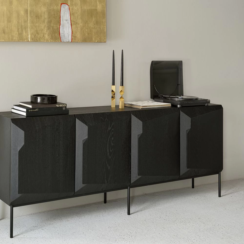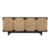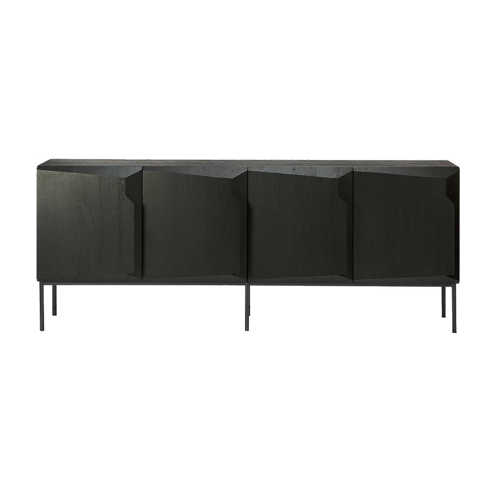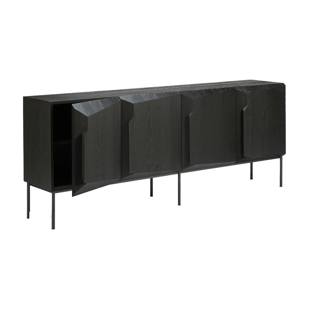 Black Oak finished 4 door media cabinet with 4 shelves and a Black metal leg frame.