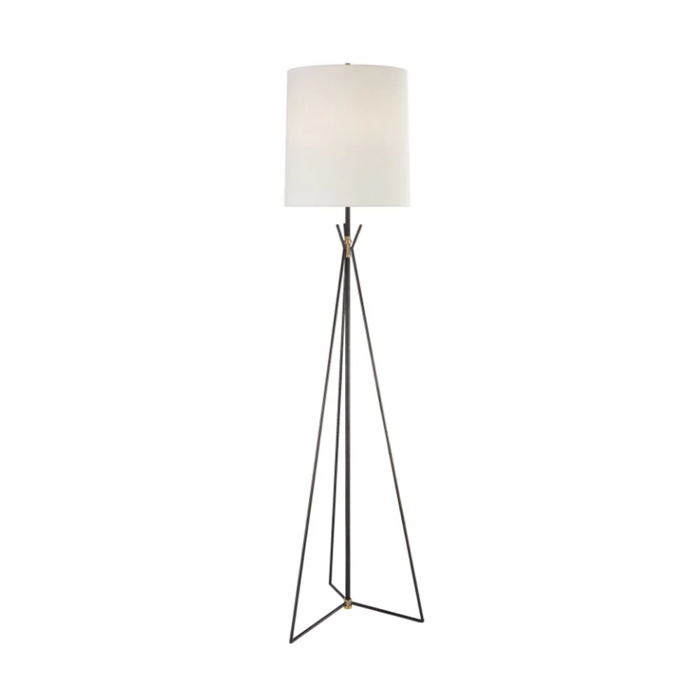 Thomas O’Brien design floor lamp in Aged Iron with Hand-Rubbed Antique Brass accents and a Linen shade.