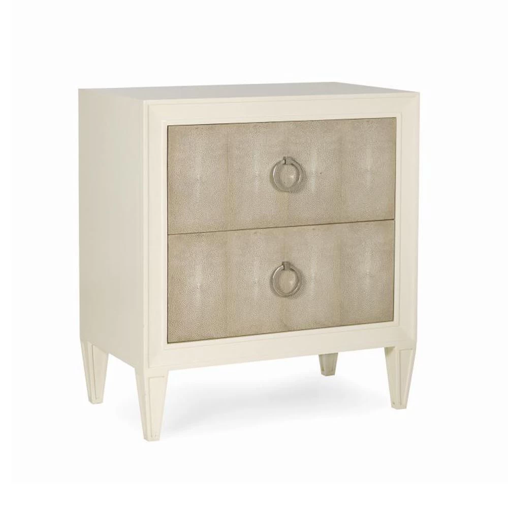 Ivory finished 2-drawer nightstand with Faux Shagreen drawer fronts.