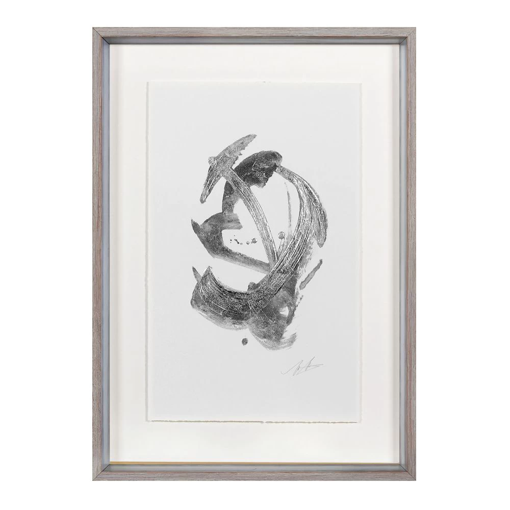 Precious abstract symbols with silver gild embellishment in a natural white wash wood frame.
