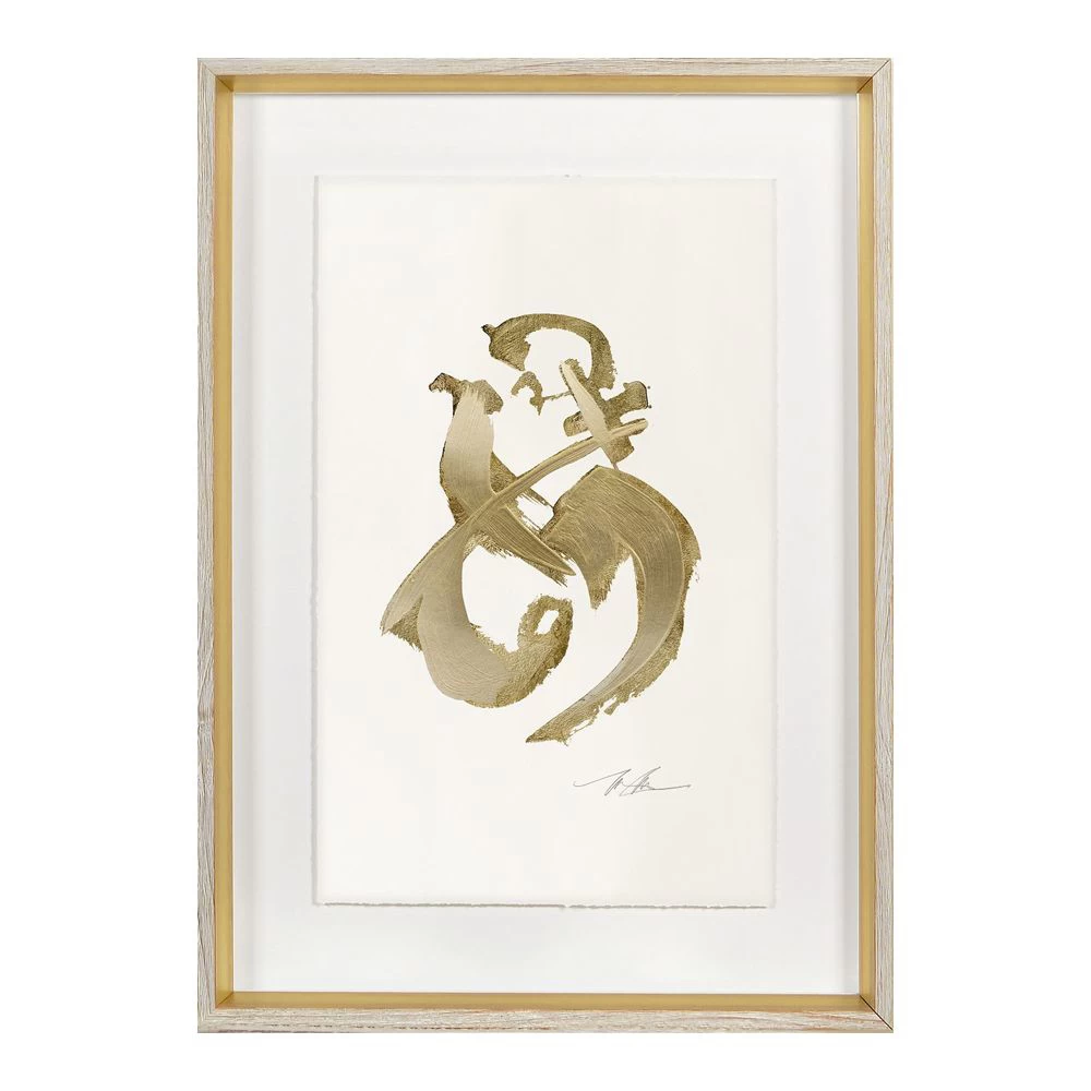 Precious abstract symbols with gold gild embellishment in a natural white wash wood frame.