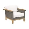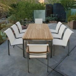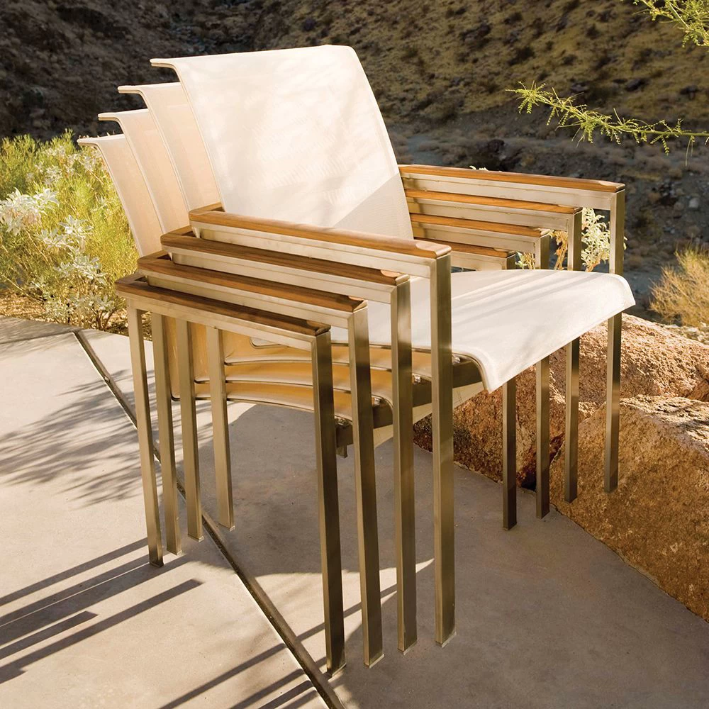 Outdoor stainless steel frame dining arm chair with washable sling support in either Cream, Black or Bronze colours.