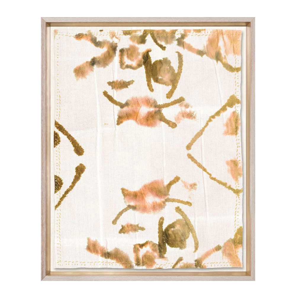 Boho-inspired fabrics in bright pink and gold tones and framed in a soft washed wood frame with an angled, gold leaf, inner face.