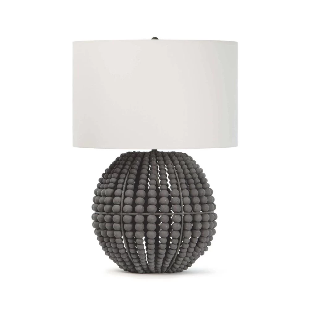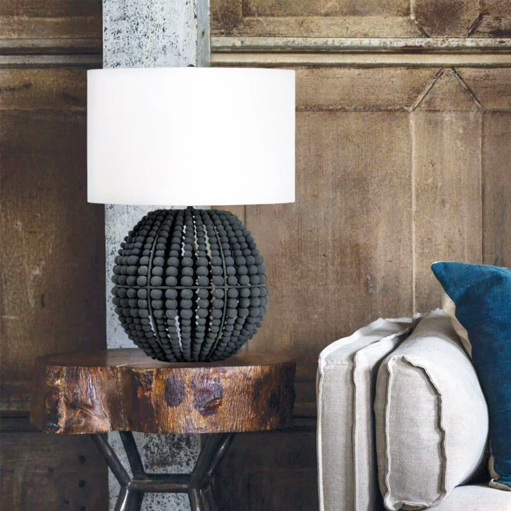 Grey beaded table lamp in birch wood with White linen shade.