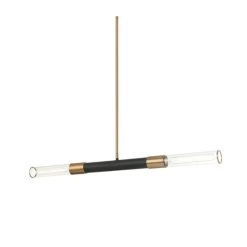 Matte black and Aged Gold Brass pendant with clear glass shades. Available in either Matte Black and Aged Gold Brass or Chrome finishes and single or double horizontal pendants and single vertical pendant.