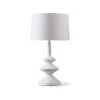 White crackle finished ceramic table lamp with tall white linen drum shade in white cotton colour.