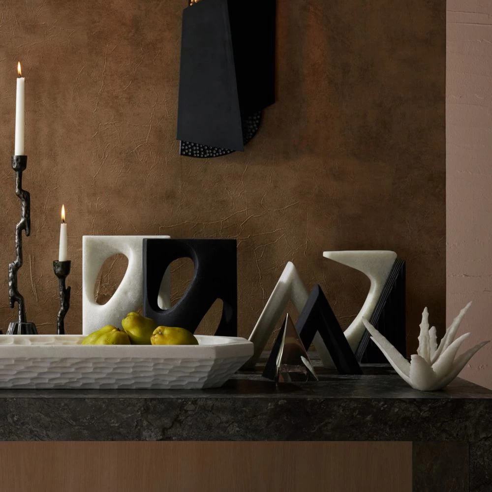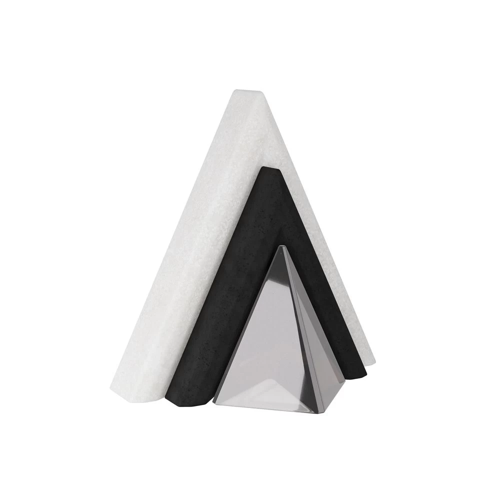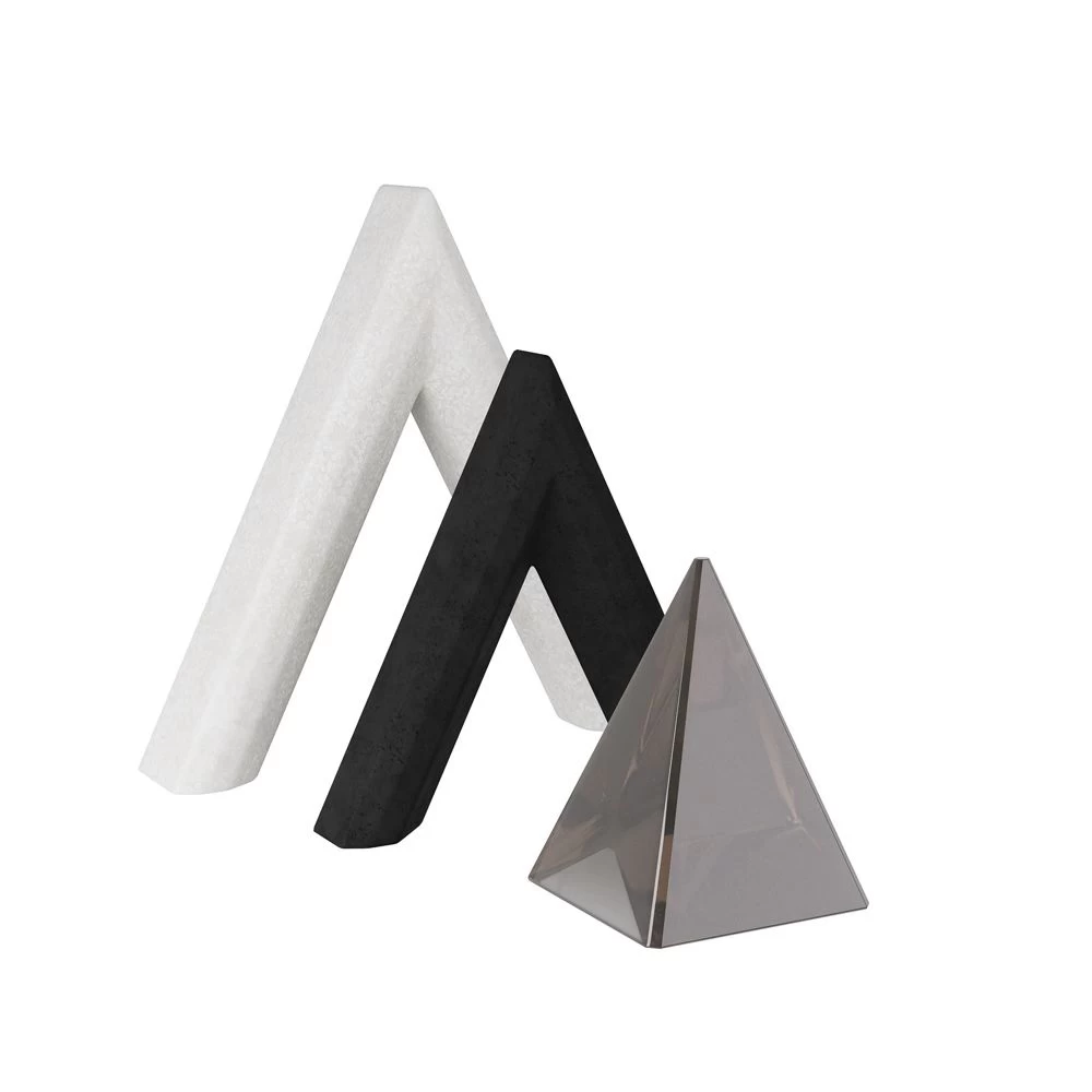 Trio of triangular shaped objects in Ivory and Black ricestone and Smoke Crystal.